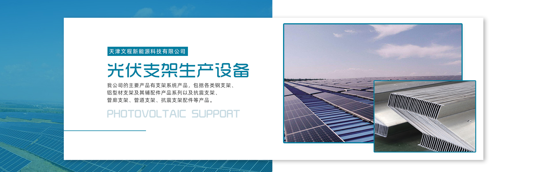 天津文程新能源科技有限公司成立于2021年,是專注于集中式、分布式、漁光互補(bǔ)和農(nóng)光互補(bǔ)等清潔能源發(fā)電的綜合性企業(yè) 公司是集設(shè)計(jì)、研發(fā)、生產(chǎn)、制造為一體的綜合型企業(yè)。公司占地面積20000平方米,注冊(cè)資金5000萬(wàn)元整。公司坐落于華北鋼鐵重鎮(zhèn)--大邱莊,距天津市區(qū)50公里、鄰104和205國(guó)道及京滬高速,交通十分便捷。 本公司擁有三個(gè)生產(chǎn)車間,其中兩個(gè)冷彎型鋼車間,一個(gè)鋅鋁鎂型鋼車間,擁有自動(dòng)冷彎成型機(jī)10條,自動(dòng)數(shù)控沖孔機(jī)10條以及焊接加工等設(shè)備。主要生產(chǎn)產(chǎn)品有:太陽(yáng)能光伏支架、各種規(guī)格的C/Z/U型鋼、抗震支架、管廊支架及整套配件等。